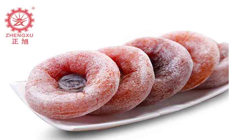 第十阶段:出霜。采用阻气好的尼龙+聚乙烯复合小袋,将柿饼单个包装,真空度不小于0.08MPa。数日后,饼面即可布满白霜,而且不易滋生霉菌。
